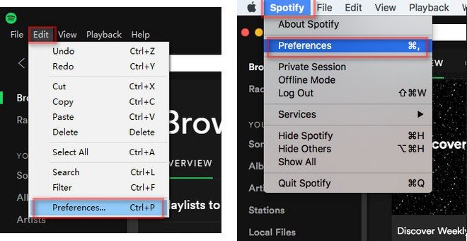 Si está utilizando un Wincomputadora personal dows, puedes presione el botón "Editar" para ver el botón "Preferencias". En cuanto a los usuarios de Mac, puede presionar el botón "Spotify” ubicado en la parte más a la izquierda de la pantalla e inmediatamente verá el botón “Preferencias” debajo de él.