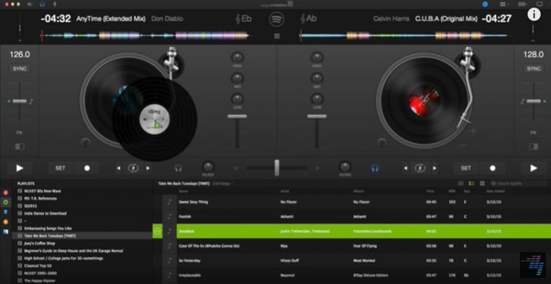 Avvia DJ Pro sul tuo Mac. Dai un'occhiata all'interfaccia di DJ Pro. Vedrai due deck sullo schermo superiore, insieme ai fader del volume, ai crossfader e ad altre funzionalità. Nella parte inferiore è dove puoi scegliere la tua musica Spotify.
