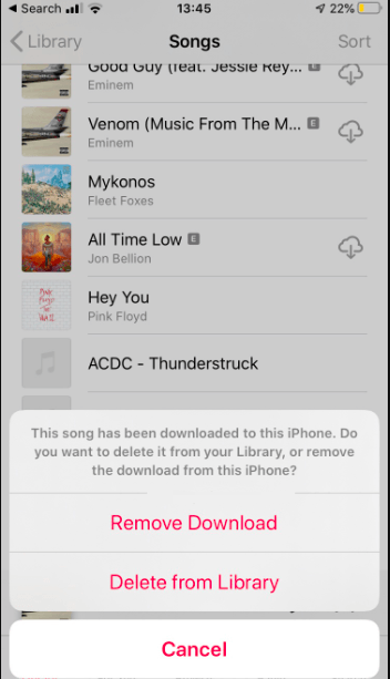 Если эта Apple Music не работает на вашем iPhone и воспроизводит только одну или две песни, вы можете просто удалить эти песни и загрузить их снова. Чтобы удалить, вы можете просто удерживать песню в своей библиотеке и из показанных вариантов выбрать меню «Удалить из библиотеки». После удаления песен повторно загрузите треки и посмотрите, сохраняется ли проблема.