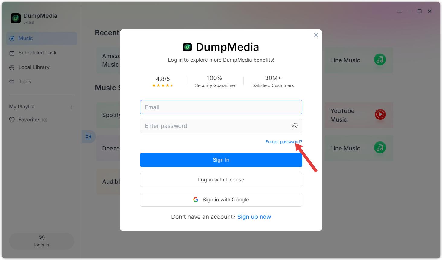 Option 1: Launch DumpMedia. Click the "login in" button or profile icon in the bottom left corner. Enter the email address and license key you used during your purchase. Click "Sign in" to complete the registration. After activation, you can download songs without any quantity limitations.